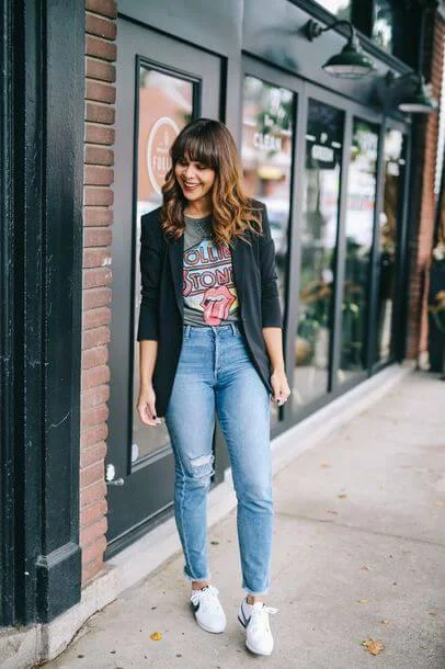 In questo caso ti consigliamo di optare per una bella t shirt nera con stampe colorate, in modo da sdrammatizzare una giacca troppo bon ton.